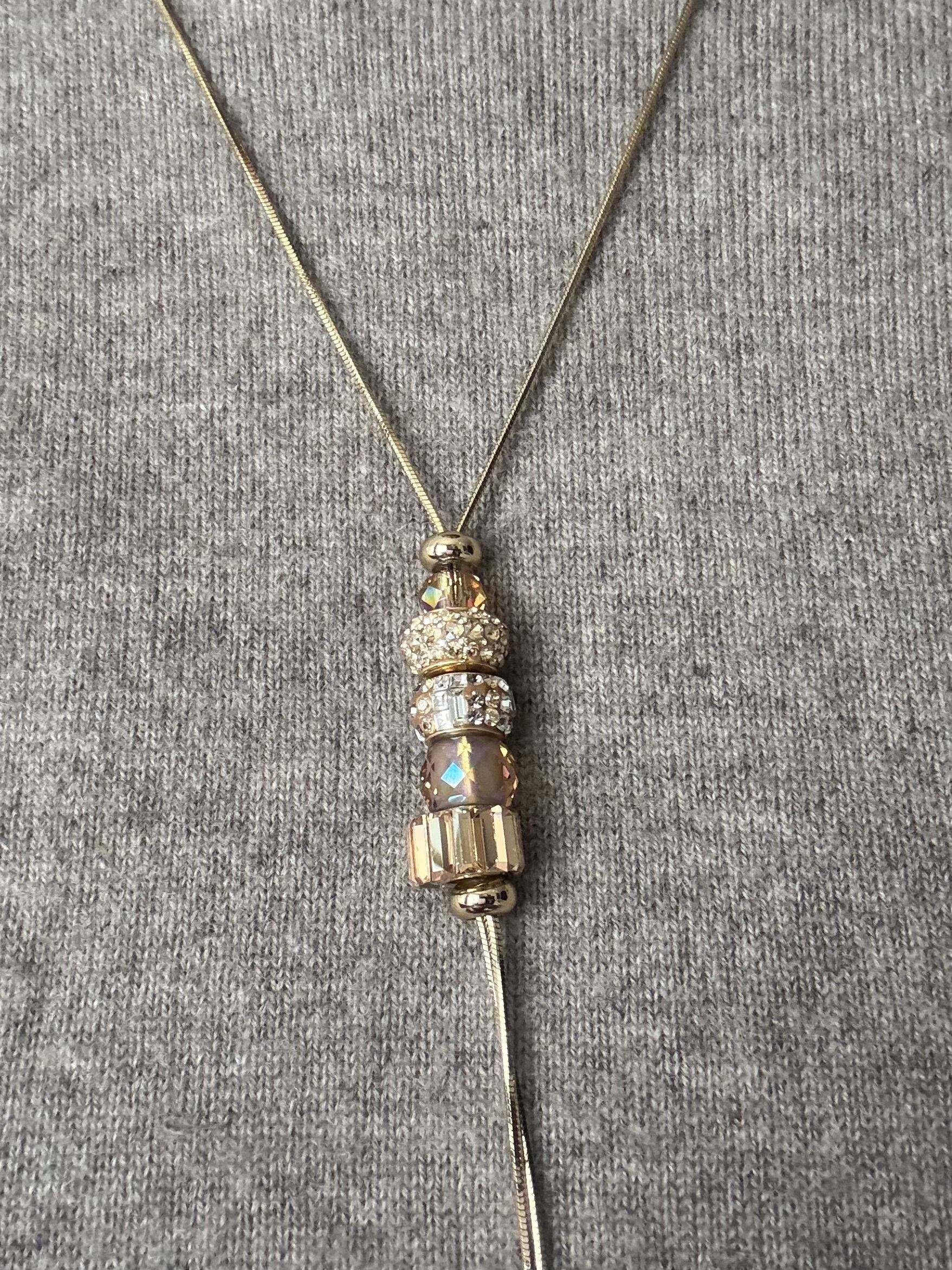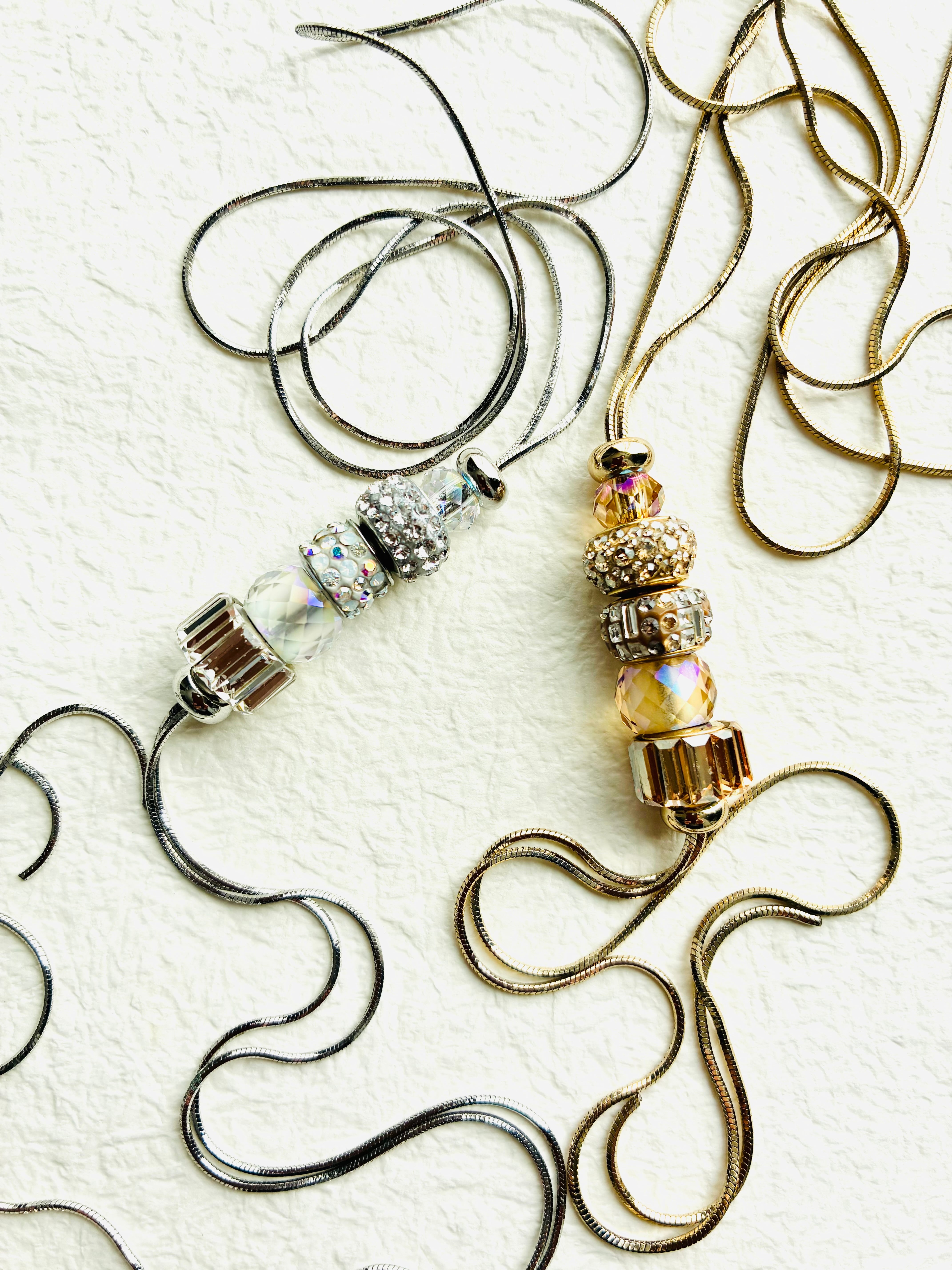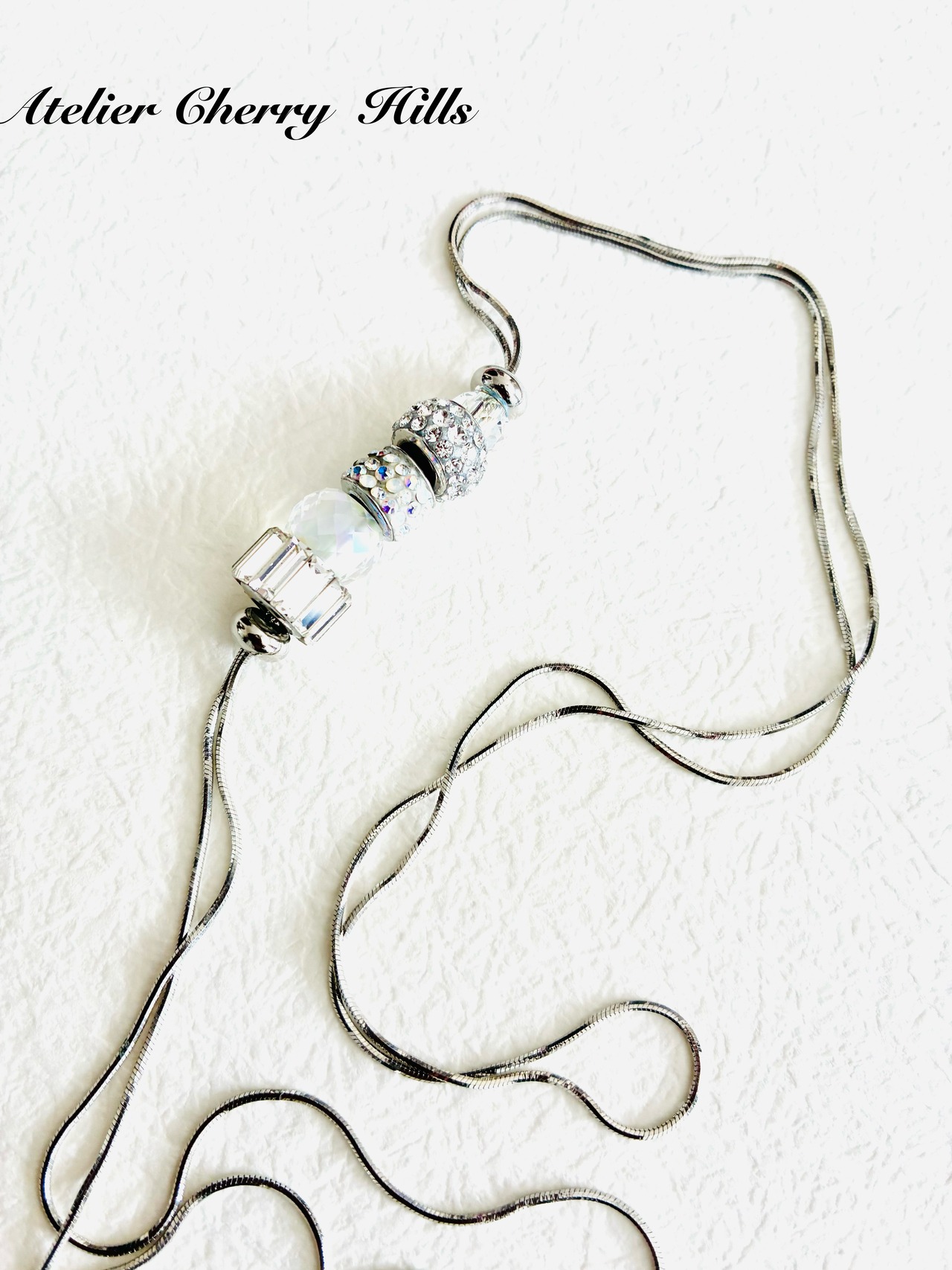 1メートルのキラキラしたスライドチェーンにクリスタルのロンデルをセットして使えるネックレスです。